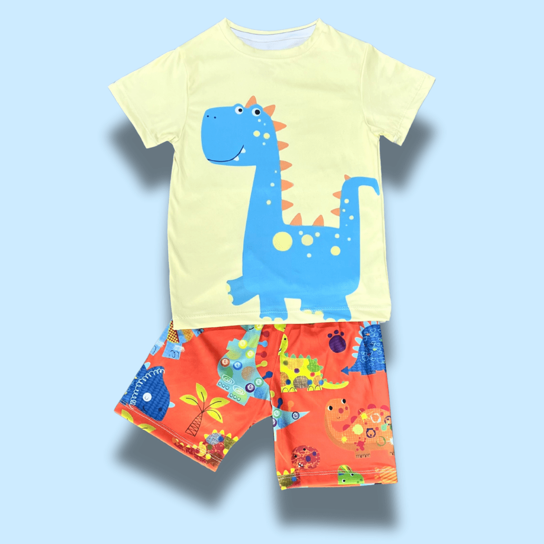 ✅ Estampado alegre de dino azul con short multicolor.
