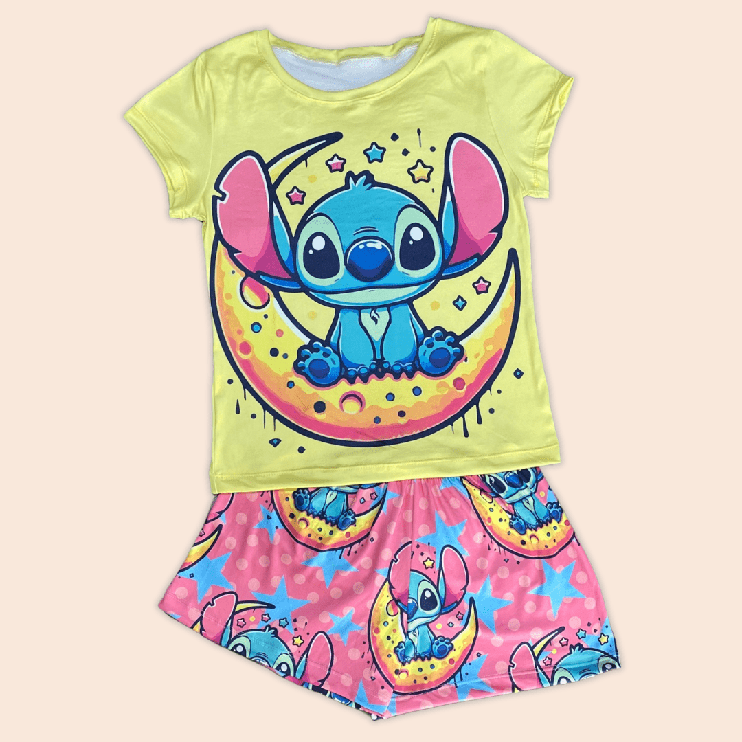 ¡Sueña bajo las estrellas con Stitch! Esta pijama con Stitch sentado sobre una luna en cuarto menguante combina una camiseta amarilla y un short rosa, perfecta para noches mágicas y relajadas. Su diseño único y tela suave garantizan comodidad absoluta. ¡Hazla tu favorita y agrégala al carrito!